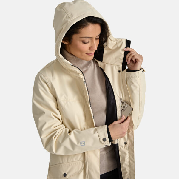 Moteriška neperšlampama ir neperpučiama parka su 40 g šiltinamuoju sluoksniu pavasariui ir rudeniui. Laidus orui išorinis audinys. Parkos vidinė dalis iš minkšto pamušalo audinio. Reguliuojami gobtuvas ir rankogaliai. Juosmens srityje guminės virvelės tunelis su stabdikliais. Neperšlampamos dengtos siūlės. Šviesą atspindinčios detalės ant viršutinio audinio.