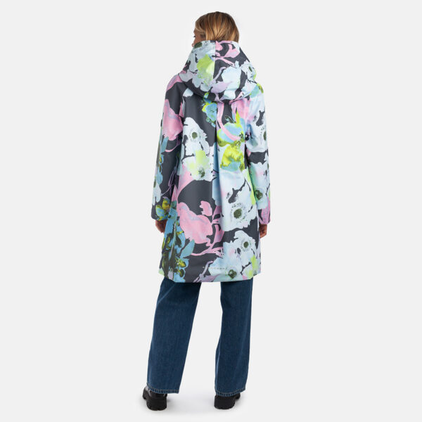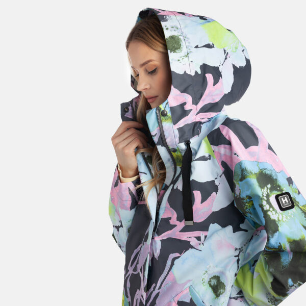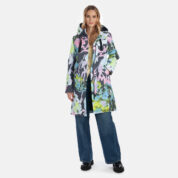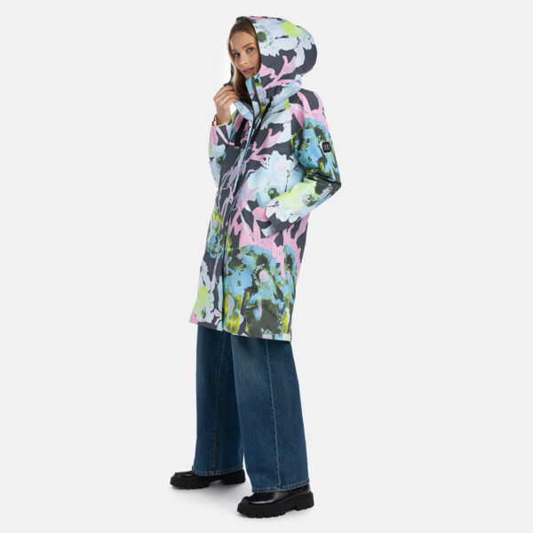 Women’s waterproof and windproof coat, suitable for spring and autumn. The outer fabric is dry-touch – which means, it has a matte effect. The lining of the parka is soft. Adjustable hood and sleeve cuffs. The outer fabric is decorated with reflective details. The front closure feature hidden magnetic snaps. It is more loose fit coat.