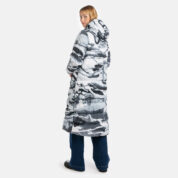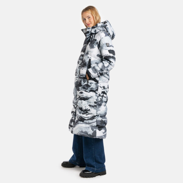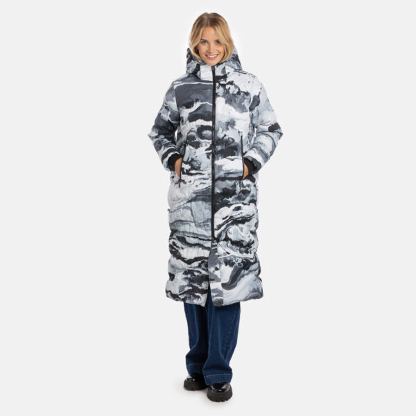 Moteriškas neperšlampamas ir neperpučiamas pūkinis paltas. Orui laidi išorinė medžiaga. Vidinė palto dalis iš minkšto pamušalinio audinio. Užpildas iš pūkų ir plunksnų. Nuimamas gobtuvas prie apykaklės prisegamas kibiu lipduku. Rankovių apačioje tamprus rankogalis. Užsegimas su dviejų krypčių užtrauktuku, apačioje kibus užsegimas. Priekyje įsiūtos kišenės su užtrauktuku. Viršutinis audinys su šviesą atspindinčiomis detalėmis.