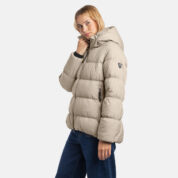 Moteriška pūkinė striukė, atspari vandeniui, vėjui, sukurta šilumai, komfortui ir apsaugai. Kvėpuojantis viršutinis audinys pagamintas iš perdirbtų pluoštų, o minkštas vidinis pamušalas suteikia jaukumo. Striukė užpildyta plunksnų ir pūkų mišiniu, kuris suteikia lengvą šilumą. Trikotažiniai rankogaliai sulaiko šilumą, dvikryptis priekinis užtrauktukas užtikrina patogų naudojimą. Nuimamas gobtuvas suteikia universalumo, o atšvaitinės detalės pagerina matomumą tamsoje.