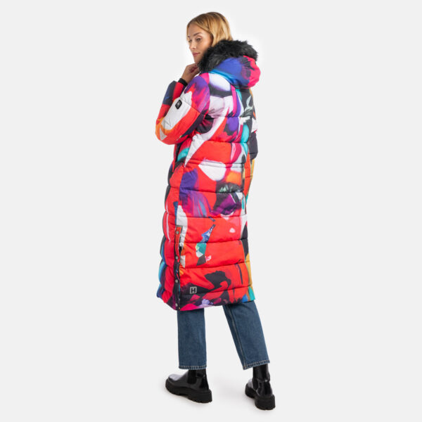 Moteriškas neperšlampamas ir neperpučiamas žieminis paltas su 400 g šiltinamuoju sluoksniu. Laidus orui išorinis audinys. Vidinėje palto pusėje minkštas pamušalo audinys. Nuimamas gobtuvas prie apykaklės prisegamas užtrauktuku. Tamprūs rankogaliai. Juosmens srityje guminės virvelės tunelis su stabdikliais. Priekyje dvikryptis užtrauktukas. Nuimamas gobtuvo apvadas iš dirbtinio kailio. Išorinis palto audinys papildytas šviesą atspindinčiomis detalėmis, kad būtų geriau matomas tamsoje.