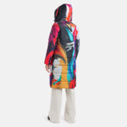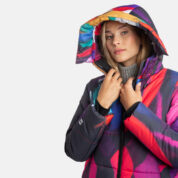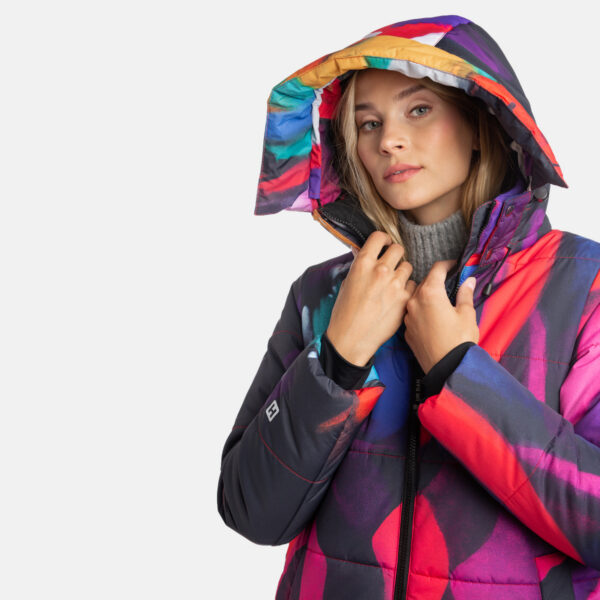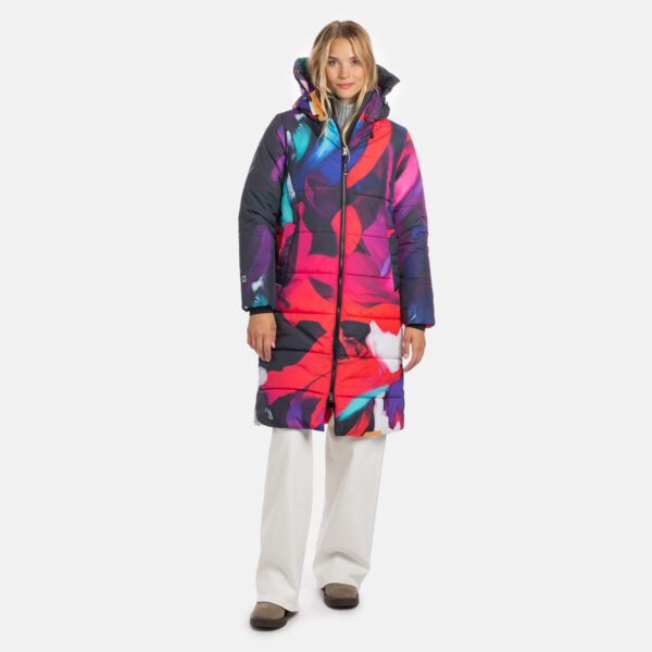 Moteriškas neperšlampamas ir neperpučiamas žieminis paltas su 300 g šiltinamuoju sluoksniu. Laidus orui išorinis audinys pagamintas iš perdirbto pluošto. Nuimamas reguliuojamas gobtuvas prie apykaklės prisegamas užtrauktuku. Išverčiamas gobtuvas su nuo vėjo saugančiu kraštu. Ant juosmens guminės virvelės tunelis su stabdikliais, kad būtų galima reguliuoti juosmens sritį iš vidaus. Elastiniai rankogaliai. Priekyje dvikryptis užtrauktukas. Šviesą atspindinčios detalės ant viršutinio audinio.