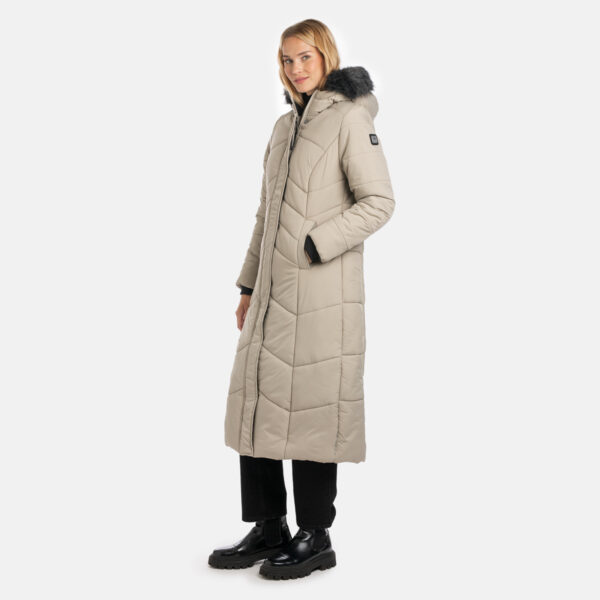 Vandeniui ir vėjui atspari moteriška žiemos striukė su 300 g pašiltinimu, užtikrinanti šilumą ir apsaugą šaltomis sąlygomis. Kvėpuojantis viršutinis audinys pagamintas iš perdirbtų pluoštų, o minkštas vidinis pamušalas suteikia jaukumo. Gobtuvas su nuimamu dirbtiniu kailiu leidžia keisti stilių, o trikotažiniai rankogaliai suteikia papildomos šilumos. Dvikryptis priekinis užtrauktukas su spaudžių juosta užtikrina patogumą ir apsaugą. Atšvaitinės detalės viršutiniame audinyje pagerina matomumą tamsoje.