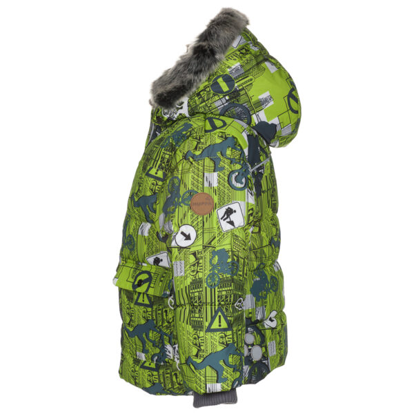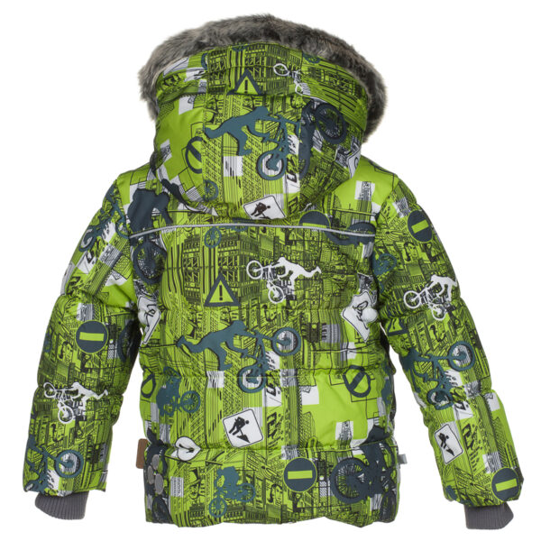 A jacket for little boys with 300 g of insulation. The jacket is lined with a comfortable flannel and taffeta lining. The removable hood protects against cold wind, the inner cuff at the sleeve opening protects against snow and wind, and the reflective details add safety when moving even in the dark.