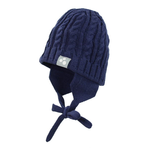 Laste kootud palmikutega müts. Lõnga koostis on 50% puuvill, 50% akrüül. Mugavamaks kandmiseks on mütsil paelad ning kõrvu kaitsvad väikesed klapid.