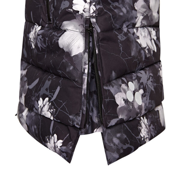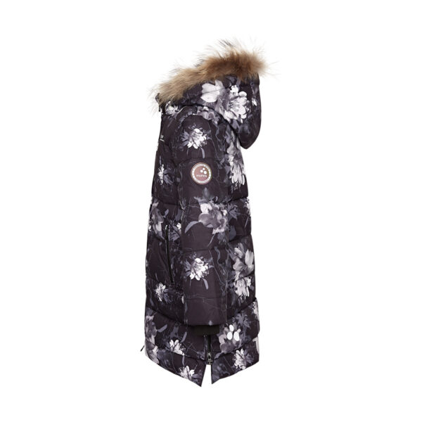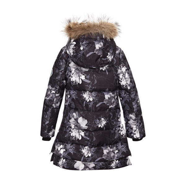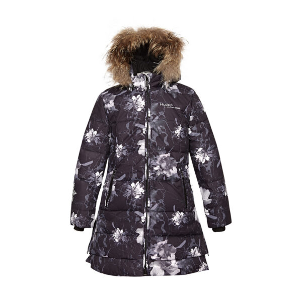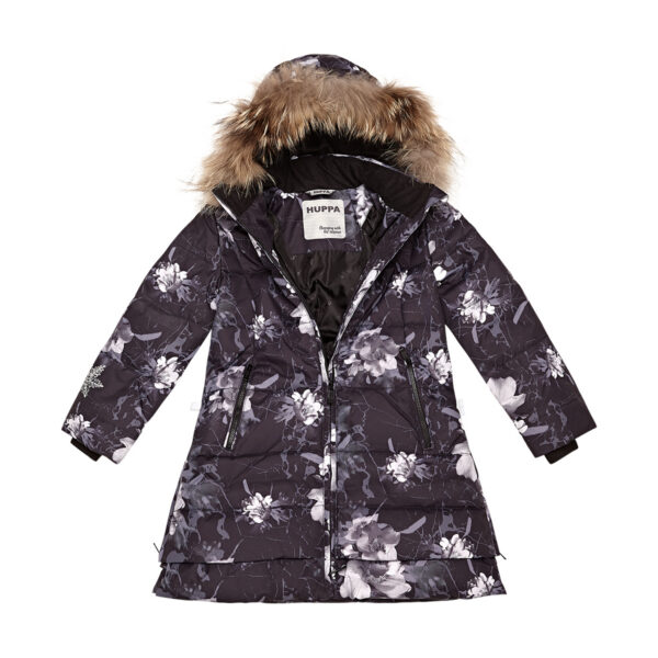Children’s waterproof and windproof down coat. Breathable fabric. Soft lining on the inside. Down feathers and feathers for filling. Removable snap-on hood. Ribbed cuffs at sleeve ends. With zipper. Integrated zipper pockets at front. Zippered side slits at lower edge. Removable natural fur trim on hood. Reflective elements on fabric.