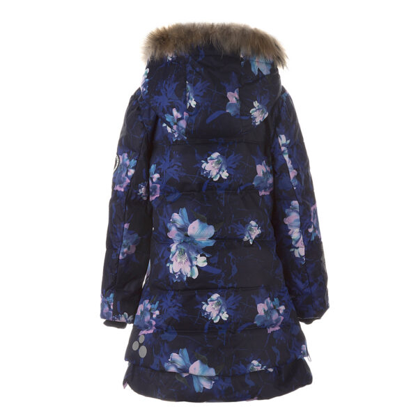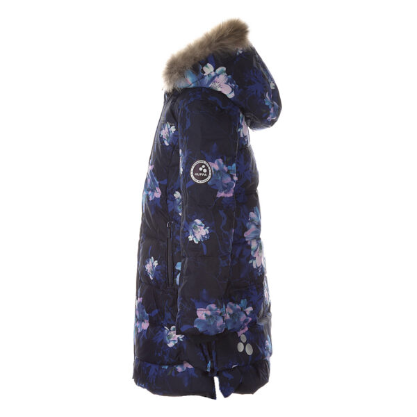 Vaikiškas vandeniui ir vėjui atsparus pūkų paltas. Kvėpuojantis audinys. Minkštas pamušalas viduje. Pūkų plunksnų ir plunksnų užpildas. Nuimamas užsegamas kapišonas. Rievėti riešiniai rankovių galuose. Su užtrauktuku. Kišenės su užtrauktukais priekyje. Šoniniai plyšiai su užtrauktukais apatiniame krašte. Nuimamas natūralaus kailio apvadas kapišone. Atšvaitiniai elementai audinyje.