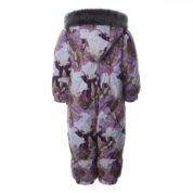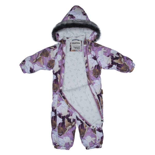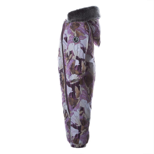 Babies’ waterproof and windproof winter overall. Breathable fabric. Flannel lining on the inside. Integrated elastic band at sleeve and leg ends and at waist on the back. Removable snap-on hood. Sleeve and leg ends can be conveniently rolled down in sizes 68–80. Waterproof taped seams. The overall has no inner leg seam. The product comes with both silicone and rubber foot straps. Faux fur trim on hood. Reflective elements on fabric.