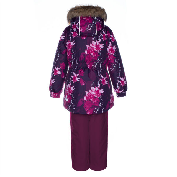 Su storesniu pašiltinimu, iš tvirtesnio audinio dviejų dalių komplektas mergaitėms. Komplektas su fliso ir taftos pamušalu. Į komplektą įeina striukė ir kelnės aukštu liemeniu. Striukė turi nuimamą gobtuvą su kailiu, fiksatoriaus pagalba reguliuojamą guminę virvelę apatiniame krašte ir kišenes. Kelnės yra su atsegamomis guminėmis petnešomis, klijuotomis sėdimos dalies ir šoninėmis kišenėmis ir su guma apsauga nuo sniego vidinėse klešnių dalyse. Šviesą atspindinčios detalės siūlėse.