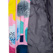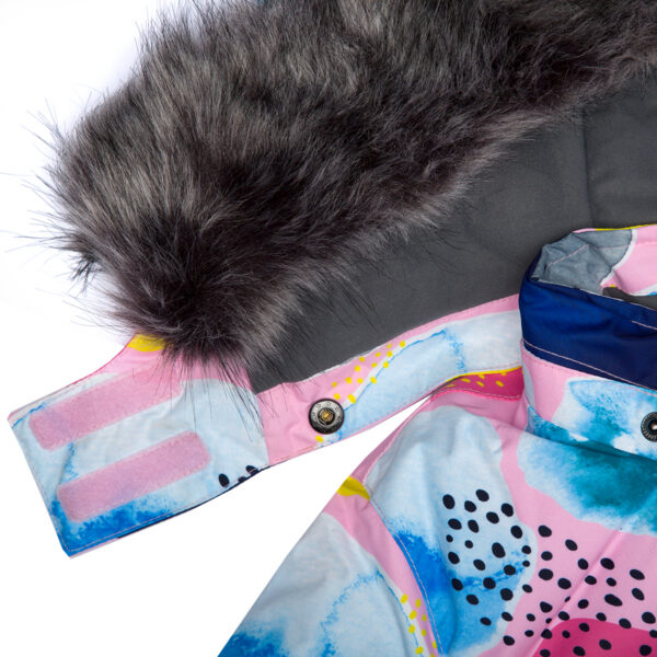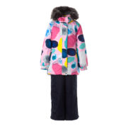 Vaikiškos striukės ir kelnių komplektas. Neperšlampantis ir vėjui atsparus, kvėpuojantis viršutinis audinys. Viduje minkštas pamušalas striukėje ir kelnėse. Elastinė juosta rankovių galuose ir liemens srityje. Nuimamas kapišonas su spaudžiamomis sagomis. Nuimamas dirbtinis kailis ant kapišono. Kelnės su nuimamomis elastinėmis ir reguliuojamomis petnešomis. Elastinė juosta liemens srityje. Sniego apsaugos kojų galuose. Užtraukiama virvutė kojų galuose. Vandeniui atsparios užlydytos siūlės. Šviesą atspindintys elementai ant striukės ir kelnių.