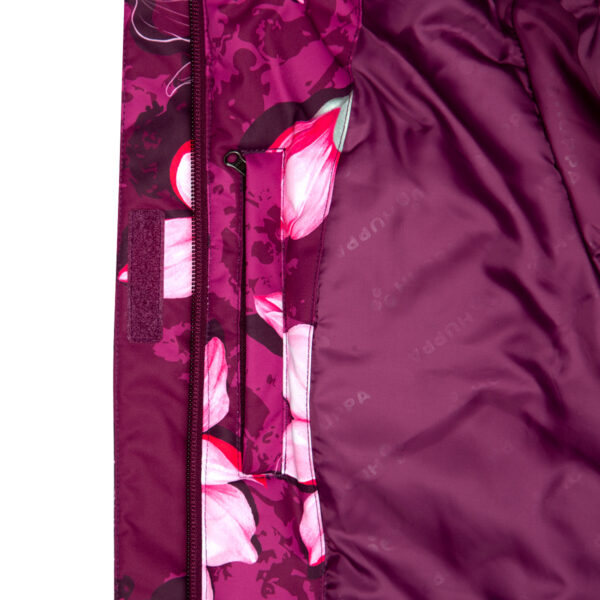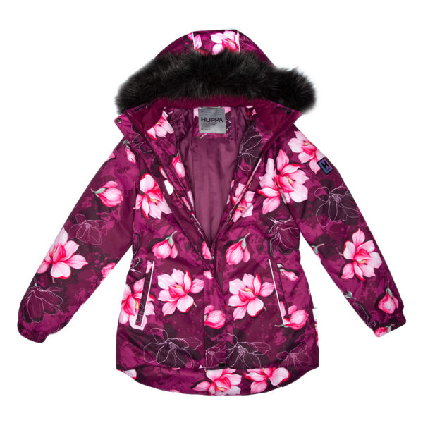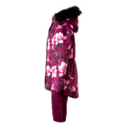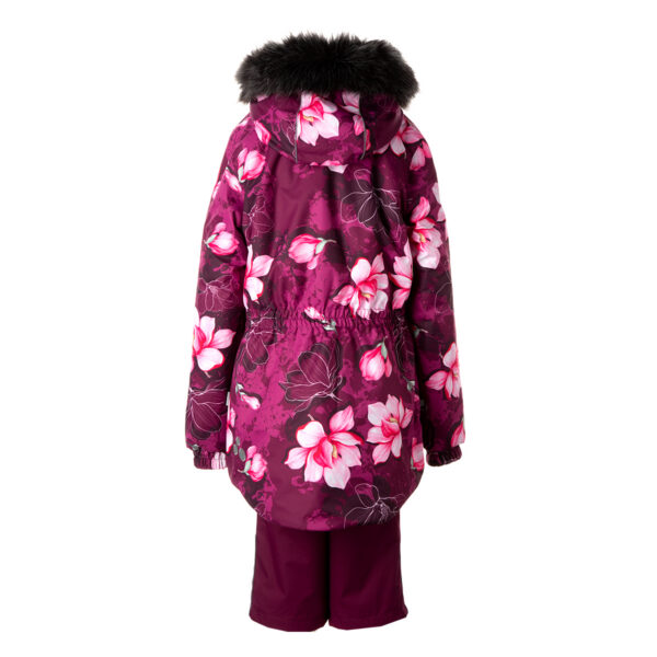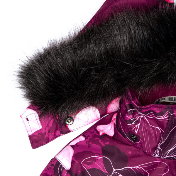 Vaikiškas striukės ir kelnių komplektas. Neperšlampamas ir neperpučiamas, orui laidus viršutinis audinys. Striukės ir kelnių vidinė pusė iš minkšto pamušalinio audinio. Rankovių apačioje ir ant juosmens įsiūta guminė juostelė. Nuimamas gobtuvas prie apykaklės prisegamas kibiu lipduku. Gobtuvas apkraštuotas nuimamu dirbtiniu kailiu. Kelnės turi nuimamas ir reguliuojamas elastines petnešas. Juosmenyje įsiūta guminė juostelė. Klešnių apačioje apsaugos nuo sniego. Klešnių apačioje įsiūta guminė juostelė su fiksatoriais. Vandeniui atsparios klijuotos siūlės. Ant striukės ir kelnių šviesą atspindinčios detalės.