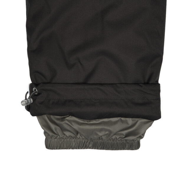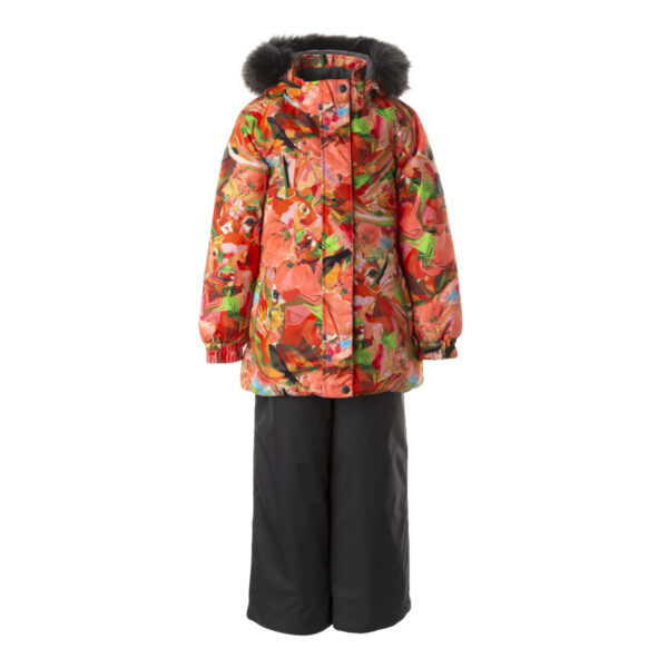 Vaikiškas striukės ir kelnių komplektas. Neperšlampamas ir neperpučiamas, orui laidus viršutinis audinys. Striukės ir kelnių vidinė pusė iš minkšto pamušalinio audinio. Rankovių apačioje ir ant juosmens įsiūta guminė juostelė. Nuimamas gobtuvas prie apykaklės prisegamas kibiu lipduku. Gobtuvas apkraštuotas nuimamu dirbtiniu kailiu. Kelnės aukštesniu liemeniu ir turi reguliuojamas elastines petnešas. Juosmenyje įsiūta guminė juostelė. Klešnių apačioje apsaugos nuo sniego. Klešnių apačioje įsiūta guminė juostelė su fiksatoriais. Vandeniui atsparios klijuotos siūlės. Kelnėse nėra klešnių vidinės siūlės. Ant striukės ir kelnių šviesą atspindinčios detalės.