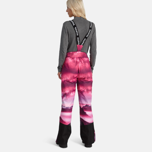 Moteriškos neperšlampamos ir neperpučiamos kelnės. Orui laidi išorinė medžiaga. Kelnių vidinė pusė iš minkšto pamušalinio audinio. Reguliuojamos nuimamos petnešos. Reguliuojamas juosmens plotis. Nugaroje, juosmenyje įsiūta guminė juostelė. Įsiūtos kišenės su užtrauktuku. Klešnių apačioje apsaugos nuo sniego. Klešnių apačios plotis reguliuojamas užtrauktuku. Vandeniui atsparios siūlės. Kelnių apačioje šviesą atspindinčios detalės.