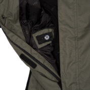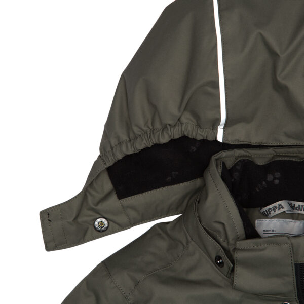 Vaikiškas neperšlampamas ir neperpučiamas kombinezonas su 200 g šiltinamuoju sluoksniu. Laidus orui išorinis audinys. Vidinėje pusėje minkštas pamušalo audinys. Nuimamas gobtuvas. Reguliuojama įsiūta guminė juostelė galinėje dalyje ir gobtuvo kraštuose. Tamprūs rankogaliai. Reguliuojami rankogaliai. Priekinis užtrauktukas dengtas juostele. Priekinės kišenės ir krūtinės kišenė su užtrauktukais. Juosmens srityje guminė juosta su kilpomis. Klešnės iš patvaraus „Cordura“ audinio. Neperšlampamos dengtos siūlės. Šviesą atspindinčios detalės ant viršutinio audinio.