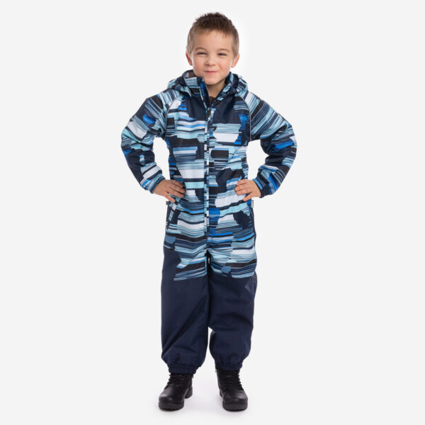 Vaikiškas neperšlampamas ir neperpučiamas vėjo 40g. pavasario/rudens kombinezonas. Tačiau dėl membranos orui laidi išorinė medžiaga, kad vaikas neprakaituotų. Kombinezono pamušalas iš minkšto audinio. Ant rankogalių ir klešnių galuose įsiūta guminė juostelė. Nuimamas gobtuvas prie apykaklės prisegamas spaudėmis. Vandeniui atsparios klijuotos siūlės. Komplekte yra elastingos guminės juostelės uždėti ant batų. Viršutinis audinys su šviesą atspindinčiomis detalėmis saugumui užtikrinti.