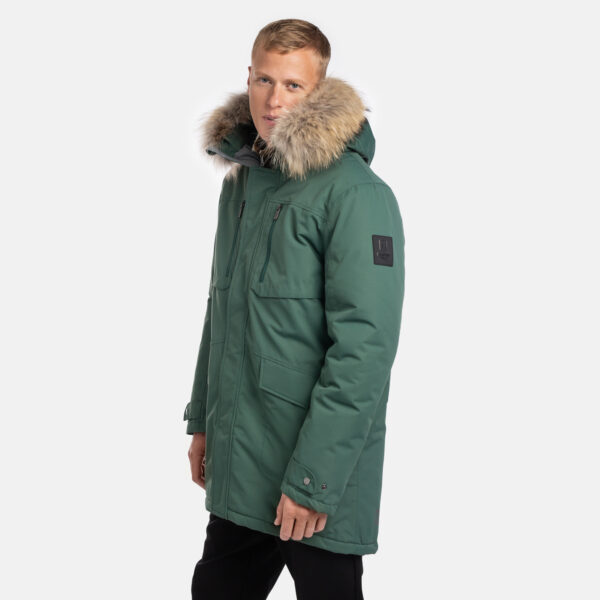Vyriška neperšlampama ir neperpučiama žieminė parka su 200g pašiltinimu HUPPA TERM(sintetinė medžiaga). Orui laidi išorinė medžiaga. Parkos pamušalas iš minkšto Teddy Fur audinio. Nusisega gobtuvas su naturaliu kailiuku. Rankogaliai su velcro reguliavimu. Dvipusis užtrauktukas .Kišenės su atvartais užsegamos magnetu. Juosmenyje įsiūta guminė juostelė su fiksatoriais. Vandeniui atsparios klijuotos siūlės. Šviesą atspindinčios detalės.