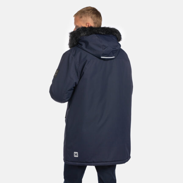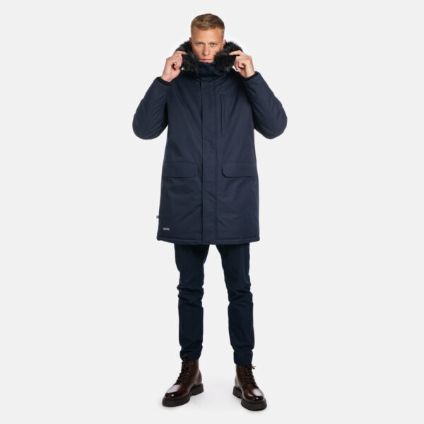 Neperšlampama ir neperpučiama žieminė vyrų parka su 300 g šiltinamuoju sluoksniu. Laidus orui išorinis audinys. Vidinėje palto pusėje minkštas pamušalo audinys. Tamprūs rankogaliai. Priekyje spaustukų juostele paslėptas dvikryptis užtrauktukas. Neperšlampamos dengtos siūlės. Apačioje guminis virvelės tunelis su stabdikliais. Gobtuvo apvadas iš dirbtinio kailio. Šviesą atspindinčios detalės ant viršutinio audinio.