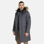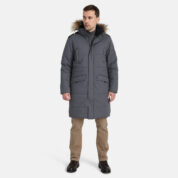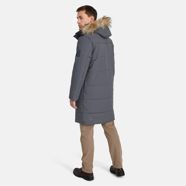 Vyriškas žieminis paltas iš minkšto audinio Neperšlampamas ir neperpučiamas viršutinis audinys Nuimamas reguliuojamas gobtuvas prie apykaklės prisegamas kibiu lipduku Rankovių apačioje tamprus rankogalis Priekyje kibia juostele dengtas dvipusis užtrauktukas Užtrauktuku užsegamas kišenes dengia atvartas su magnetiniu užsegimu Gobtuvas apkraštuotas natūraliu kailiu Viršutinis audinys su šviesą atspindinčiomis detalėmis