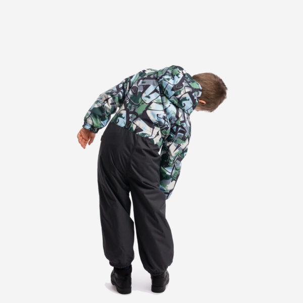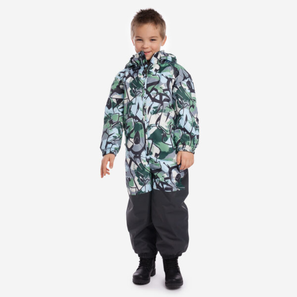 Vaikiškas neperšlampamas ir neperpučiamas vėjo 40g. pavasario/rudens kombinezonas. Tačiau dėl membranos orui laidi išorinė medžiaga, kad vaikas neprakaituotų. Kombinezono pamušalas iš minkšto audinio. Ant rankogalių ir klešnių galuose įsiūta guminė juostelė. Nuimamas gobtuvas prie apykaklės prisegamas spaudėmis. Vandeniui atsparios klijuotos siūlės. Komplekte yra elastingos guminės juostelės uždėti ant batų. Viršutinis audinys su šviesą atspindinčiomis detalėmis saugumui užtikrinti.