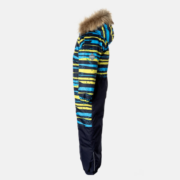 Vaikiškas neperšlampamas ir neperpučiamas kombinezonas. Orui laidi išorinė medžiaga. Kombinezono pamušalas iš minkšto audinio. Ant rankogalių ir klešnių galuose įsiūta guminė juostelė. Nuimamas gobtuvas prie apykaklės prisegamas kibiu lipduku. Priekyje įsiūtos kišenės su užtrauktuku. Vandeniui atsparios klijuotos siūlės. Komplekte yra elastingos guminės juostelės kelnėms prisegti prie batų. Gobtuvas apkraštuotas nuimamu dirbtiniu kailiu. Viršutinis audinys su šviesą atspindinčiomis detalėmis.