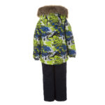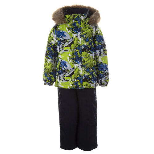 Vaikiškas striukės ir kelnių komplektas. Neperšlampamas ir neperpučiamas, orui laidus viršutinis audinys. Striukės ir kelnių vidinė pusė iš minkšto pamušalinio audinio. Rankovių apačioje ir ant juosmens įsiūta guminė juostelė. Nuimamas gobtuvas prie apykaklės prisegamas kibiu lipduku. Gobtuvas apsiūtas dirbiniu kailiu. Kelnės aukštesniu liemeniu ir turi reguliuojamas elastines petnešas. Juosmenyje įsiūta guminė juostelė. Klešnių apačioje įsiūta guminė juostelė su fiksatoriais. Vandeniui atsparios klijuotos siūlės. Kelnėse nėra klešnių vidinės siūlės. Ant striukės ir kelnių šviesą atspindinčios detalės.