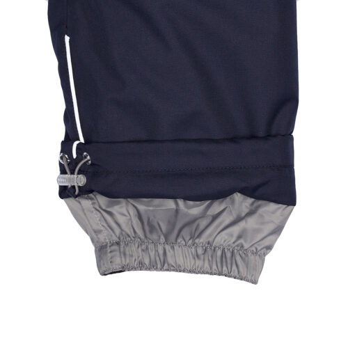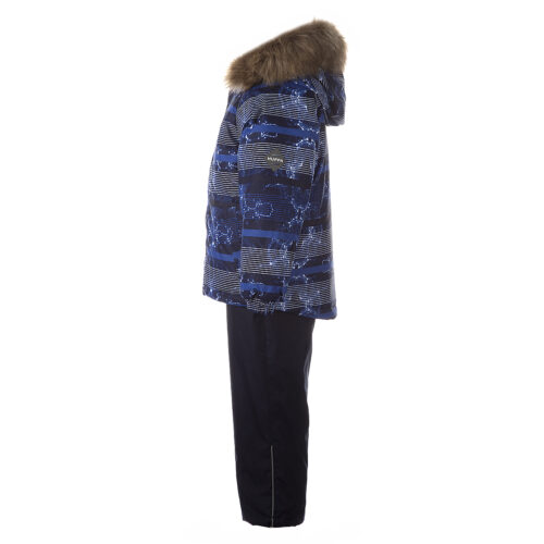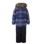 Vaikiškas striukės ir kelnių komplektas. Neperšlampamas ir neperpučiamas, orui laidus viršutinis audinys. Striukės ir kelnių vidinė pusė iš minkšto pamušalinio audinio. Rankovių apačioje ir ant juosmens įsiūta guminė juostelė. Nuimamas gobtuvas prie apykaklės prisegamas kibiu lipduku. Gobtuvas apsiūtas dirbiniu kailiu. Kelnės aukštesniu liemeniu ir turi reguliuojamas elastines petnešas. Juosmenyje įsiūta guminė juostelė. Klešnių apačioje įsiūta guminė juostelė su fiksatoriais. Vandeniui atsparios klijuotos siūlės. Kelnėse nėra klešnių vidinės siūlės. Ant striukės ir kelnių šviesą atspindinčios detalės.