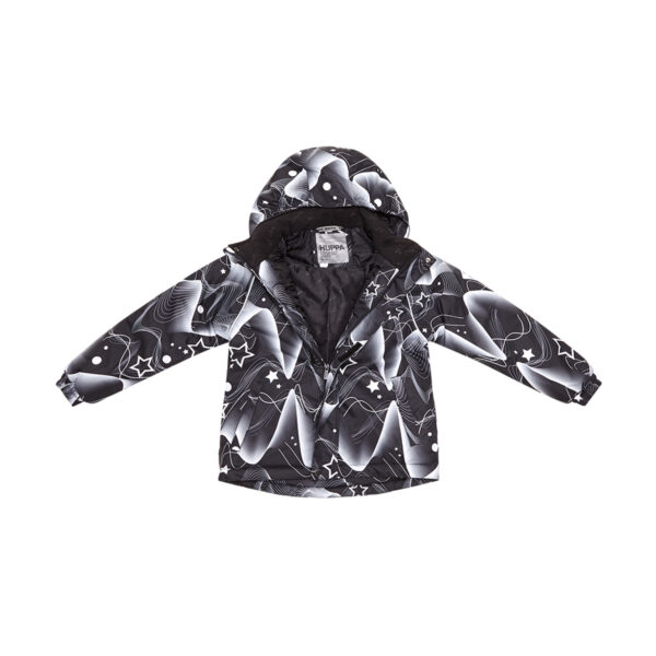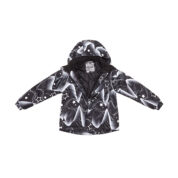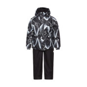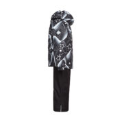 Vaikiškas striukės ir kelnių komplektas. Neperšlampamas ir neperpučiamas, orui laidus viršutinis audinys. Striukės ir kelnių vidinė pusė iš minkšto pamušalinio audinio. Rankovių apačioje ir gobtuvo krašte įsiūta guminė juostelė. Nuimamas gobtuvas prie apykaklės prisegamas kibiu lipduku. Kelnės aukštesniu liemeniu ir turi reguliuojamas elastines petnešas. Juosmenyje įsiūta guminė juostelė. Klešnių apačioje įsiūta guminė juostelė su fiksatoriais. Vandeniui atsparios klijuotos siūlės. Kelnėse nėra klešnių vidinės siūlės. Ant striukės ir kelnių šviesą atspindinčios detalės.