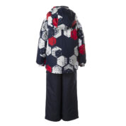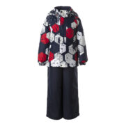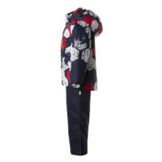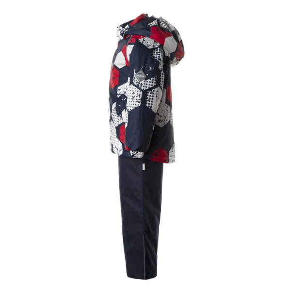 Vaikiškas striukės ir kelnių komplektas. Neperšlampamas ir neperpučiamas, orui laidus viršutinis audinys. Striukės ir kelnių vidinė pusė iš minkšto pamušalinio audinio. Rankovių apačioje ir gobtuvo krašte įsiūta guminė juostelė. Nuimamas gobtuvas prie apykaklės prisegamas kibiu lipduku. Kelnės aukštesniu liemeniu ir turi reguliuojamas elastines petnešas. Juosmenyje įsiūta guminė juostelė. Klešnių apačioje įsiūta guminė juostelė su fiksatoriais. Vandeniui atsparios klijuotos siūlės. Kelnėse nėra klešnių vidinės siūlės. Ant striukės ir kelnių šviesą atspindinčios detalės.