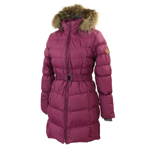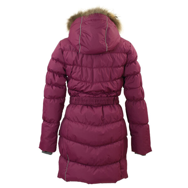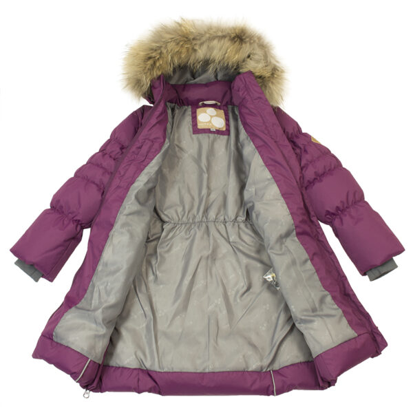 Pūkinis mergaičių paltas itin patogus! Vėjui ir vandeniui atsparus palto audinys yra ypač minkštas, užpildas – pūkai 50% ir plunksnos 50%. Minkšto fliso ir taftos pamušalas yra patogus ir šiltas. Trikotažiniai vidiniai rankogaliai leidžia išlikti sausiems ir nesušalti net sningant. Geriausią matomumą tamsoje užtikrina atšvaitai, o rankovė papuošta šviesą atspindinčia aplikacija. Nuimamas gobtuvas prisegamas spaustukais, jo natūralų kailį taip pat galima nuimti. Palto priekinės kišenės yra su užtrauktuku. Puošnus pūkinis paltas mokyklai!