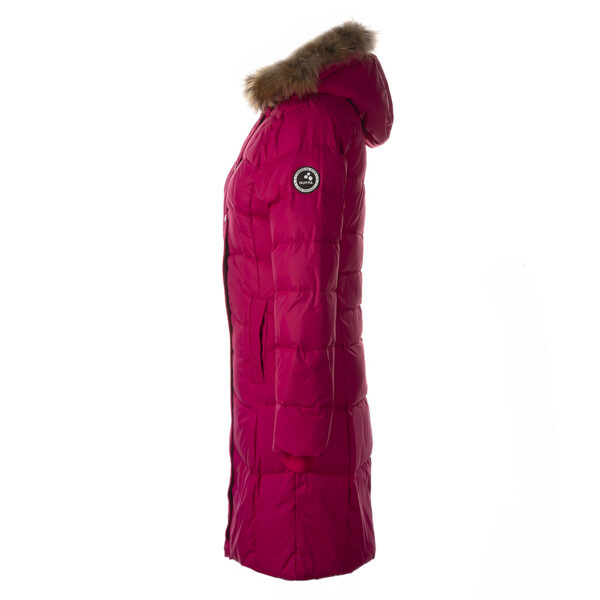Stilingas vandeniui ir vėjui atsparus mergaičių pūkinis paltas. Kvėpuojantis audinys. Viduje minkštas pamušalas. Pūkų ir plunksnų užpildas. Nuimamas kapišonas su spaudukais. Rievėti rankovių užveržimai. Dvipusis užtrauktukas, uždengtas spaudukų klostės priekyje. Nuimamas natūralaus kailio apvadas kapišone. Viršutiniame audinyje yra atšvaitiniai elementai matomumui tamsoje.