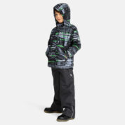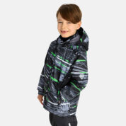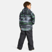 Vaikiškas pereinamojo laikotarpio striukės ir kelnių komplektas. Neperšlampamas ir neperpučiamas, orui laidus viršutinis audinys. Striukės ir kelnių vidus pasiūtas iš minkšto pamušalo audinio. Rankogaliuose ir gobtuvo krašte yra guminė juostelė. Nuimamas gobtuvas pritvirtinamas prie apykaklės spaudėmis. Kelnės turi aukštesnį liemenį ir reguliuojamas elastines petnešas. Elastinė guminė juostelė ties liemeniu. Klešnių galuose tunelis guminei juostelei su ribotuvais. Vandeniui atspari klijuota sėdimos dalies siūlė. Kelnės neturi klešnių vidinės siūlės. Tiek striukė, tiek ir kelnės su atšvaito detalėmis.