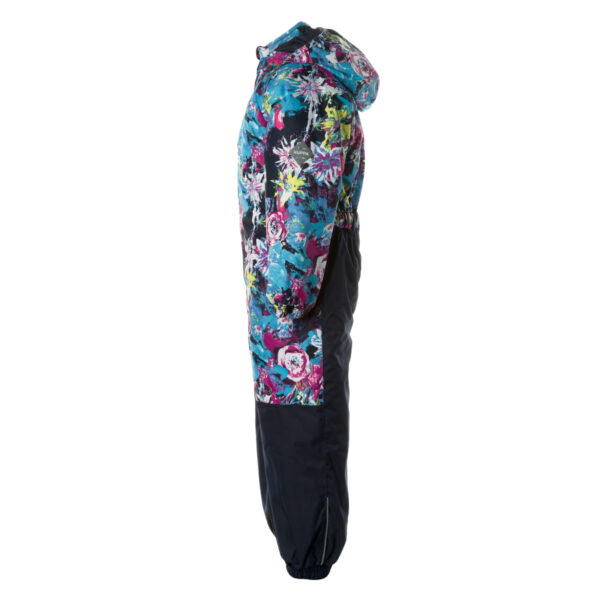 Vaikiškas neperšlampamas ir neperpučiamas kombinezonas Orui laidi išorinė medžiaga Kombinezono vidus iš flanelinio pamušalinio audinio Rankovių ir klešnių apačioje ir gobtuvo krašte įsiūta guminė juostelė Nuimamas gobtuvas prie apykaklės prisegamas kibiu lipduku Priekyje įsiūtos kišenės su užtrauktuku Vandeniui atsparios klijuotos siūlės Komplekte yra elastingos guminės juostelės kelnėms prisegti prie batų Viršutinis audinys su šviesą atspindinčiomis detalėmis