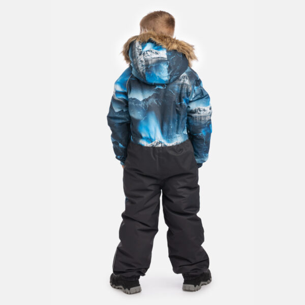 Vaikiškas neperšlampamas ir neperpučiamas žieminis kombinezonas su 200 g šiltinamuoju sluoksniu. Laidus orui išorinis audinys. Kombinezono vidinė dalis iš minkšto audinio. Guminė juostelė rankogaliuose, klešnių apačioje ir ant gobtuvo krašto. Nuimamas gobtuvas prie apykaklės prisegamas užtrauktuku. Juosmens srityje guminė juosta su kilpomis. Neperšlampamos dengtos siūlės. Su elastingomis pėdos gumelėmis. Šviesą atspindinčios detalės ant viršutinio audinio.