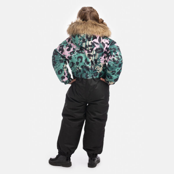 Vaikiškas neperšlampamas ir neperpučiamas kombinezonas. Orui laidi išorinė medžiaga. Kombinezono pamušalas iš minkšto audinio. Ant rankogalių ir klešnių galuose įsiūta guminė juostelė. Nuimamas gobtuvas prie apykaklės prisegamas kibiu lipduku. Priekyje įsiūtos kišenės su užtrauktuku. Vandeniui atsparios klijuotos siūlės. Komplekte yra elastingos guminės juostelės kelnėms prisegti prie batų. Gobtuvas apkraštuotas nuimamu dirbtiniu kailiu. Viršutinis audinys su šviesą atspindinčiomis detalėmis.