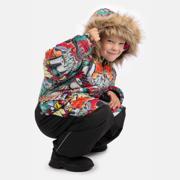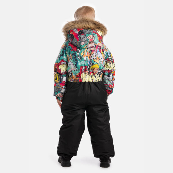 Vaikiškas neperšlampamas ir neperpučiamas kombinezonas. Orui laidi išorinė medžiaga. Kombinezono pamušalas iš minkšto audinio. Ant rankogalių ir klešnių galuose įsiūta guminė juostelė. Nuimamas gobtuvas prie apykaklės prisegamas kibiu lipduku. Priekyje įsiūtos kišenės su užtrauktuku. Vandeniui atsparios klijuotos siūlės. Komplekte yra elastingos guminės juostelės kelnėms prisegti prie batų. Gobtuvas apkraštuotas nuimamu dirbtiniu kailiu. Viršutinis audinys su šviesą atspindinčiomis detalėmis.