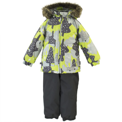 Dviejų dalių klasikinis komplektas mažyliams. Komplektas su minkštu medvilniniu fliso pamušalu, kvėpuojančiu bei vandeniui atspariu išoriniu audiniu. Su aukštu juosmeniu kelnių sėdimos dalies siūlė yra klijuota, kad nepraleistų drėgmės. Komplektas su nuimamu gaubtuvu su kailiu, reguliuojamomis petnešomis ir dviem kišenėmis. Šviesą atspindinčios detalės siūlėse.