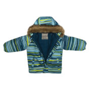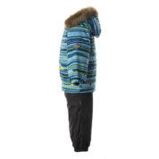 Vaikiškas striukės ir kelnių komplektas Neperšlampamas ir neperpučiamas, orui laidus viršutinis audinys Striukės ir kelnių vidinė pusė iš minkšto pamušalinio audinio Rankovių apačioje įsiūta guminė juostelė Nuimamas gobtuvas prie apykaklės prisegamas kibiu lipduku Gobtuvas apsiūtas dirbiniu kailiu Kelnės aukštesniu liemeniu ir turi reguliuojamas elastines petnešas Ant juosmens ir klešnių galuose įsiūta guminė juostelė Vandeniui atsparios klijuotos siūlės Kelnėse yra elastingos guminės juostelės kelnėms prisegti prie batų Ant striukės ir kelnių šviesą atspindinčios detalės