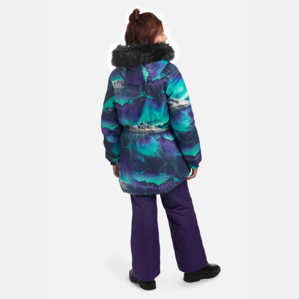 Vaikiškas striukės ir kelnių komplektas. Neperšlampamas ir neperpučiamas, orui laidus viršutinis audinys. Striukės ir kelnių vidinė pusė iš minkšto pamušalinio audinio. Rankovių apačioje ir ant juosmens įsiūta guminė juostelė. Nuimamas gobtuvas prie apykaklės prisegamas kibiu lipduku. Gobtuvas apkraštuotas nuimamu dirbtiniu kailiu. Kelnės turi nuimamas ir reguliuojamas elastines petnešas. Juosmenyje įsiūta guminė juostelė. Klešnių apačioje apsaugos nuo sniego. Klešnių apačioje įsiūta guminė juostelė su fiksatoriais. Vandeniui atsparios klijuotos siūlės. Ant striukės ir kelnių šviesą atspindinčios detalės.