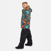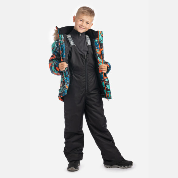 Vaikiškas striukės ir kelnių komplektas. Neperšlampamas ir neperpučiamas, orui laidus viršutinis audinys. Striukės ir kelnių vidinė pusė iš minkšto pamušalinio audinio. Rankovių apačioje ir ant juosmens įsiūta guminė juostelė. Nuimamas gobtuvas prie apykaklės prisegamas kibiu lipduku. Gobtuvas apsiūtas dirbiniu kailiu. Kelnės aukštesniu liemeniu ir turi reguliuojamas elastines petnešas. Juosmenyje įsiūta guminė juostelė. Klešnių apačioje įsiūta guminė juostelė su fiksatoriais. Vandeniui atsparios klijuotos siūlės. Kelnėse nėra klešnių vidinės siūlės. Ant striukės ir kelnių šviesą atspindinčios detalės.