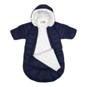 Kūdikių šiltas, neperšlampamas ir neperpučiamas vokelis-kombinezonas Orui laidi išorinė medžiaga Vokelio vidus iš flanelinio pamušalinio audinio Rankogaliuose ir gobtuvo krašte įsiūta guminė juostelė Patogūs atverčiami rankogaliai Kuriant buvo atsižvelgta ir į vaiko saugumą automobilyje – gaminio užpakalyje yra skylės saugos lopšio diržams pritvirtinti, todėl vaikas prie saugos lopšio bus prisegtas saugiai Automobilinės kėdutės diržų negalima juosti ant drabužių, nes vaikas nebus saugiai prisegtas Važiavimas automobiliu bus ne tik saugus, bet ir patogus, nes vaikas automobilyje nesukais Vokelį-kombinezoną galima patogiai atsegti, saugos lopšio diržus susegti virš drabužių, o prireikus išeiti į lauką, kombinezoną galima ir vėl greitai aprengti