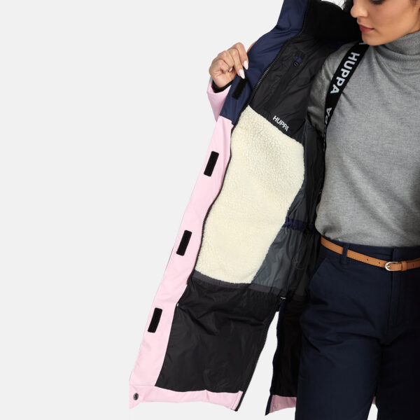 Ūdens un vēja noturīgs mētelis ar spalvu pildījumu sievietēm. Elpojošs virsaudums. Mēteļa iekšpusē mīksts oderaudums. Muguras augšdaļā aitādas imitācijas odere. Pildījumā dūnas un spalvas. Piedurkņu galos aproce ar valnīti. Priekšējā aizdarē divvirzienu rāvējslēdzējs ar pārloku ar spiedpogām. Kapucei noņemama mākslīgās kažokādas apmale. Labākai redzamībai tumšā laikā mēteļa virsaudumam ir pievienotas atstarojošas detaļas.
