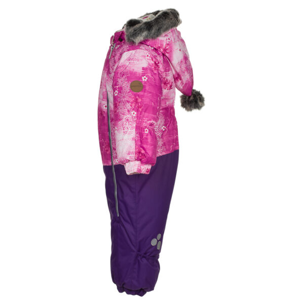 toddler´s winter overall with 300g of insulation. The overall has a soft cotton flannel lining and a breathable and waterproof outer fabric that is perfectly suited to our climate. The overall has a seat seam and side seams along the waistline taped to be waterproof. The overall has a removable hood with a separately removable fur, a zippered pocket for storing treats and silicone rubber under the sole. Up to size 80, the sleeve ends and bottom hem can be rolled back in a few movements, and gloves and boots are not needed.
