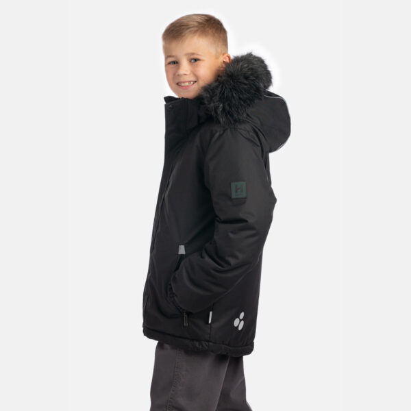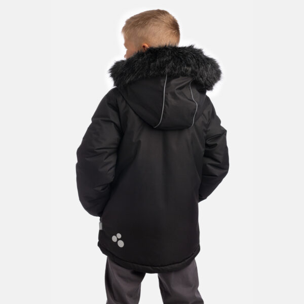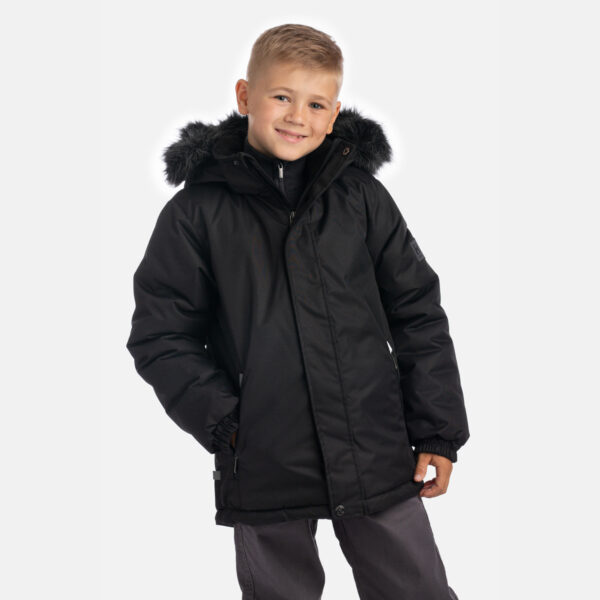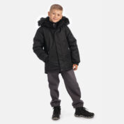 Bērnu ūdens un vēja necaurlaidīga jaka Gaisu caurlaidīgs virsējais audums Mīksts jakas oderes audums Noņemamā kapuce pie apkakles stiprinās ar velkro aizdari Piedurknes apstrādātas ar gumijas apdari Priekšpusē rāvējslēdzēja aizdare Priekšpusē aizdarāmas kabatas Kapucei noņemama mākslīgās kažokādas mala Auduma virspusē atstarojošas detaļas