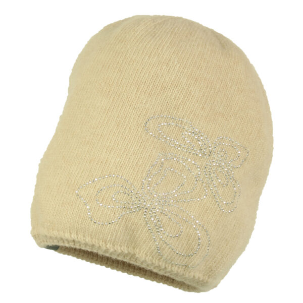 A warm and soft hat decorated with shiny stones. The hat is double knitted and the yarn composition is 80% wool and 20% nylon.