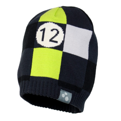 Children´s knitted spring-autumn hat. The hat with a woven pattern is knitted from a soft 60% cotton, 40% acrylic yarn blend. The bottom of the hat is knitted in ribbed fabric for more comfortable wearing.