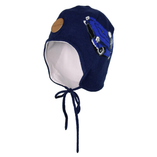 Children´s knitted spring-autumn hat. The hat is knitted from a 60% cotton, 40% acrylic yarn blend and the lining is soft cotton jersey. For more comfortable wearing, the ear parts of the hat have been extended and tie-down straps have been added to keep the hat on the head better. The ears have additional wind protection.