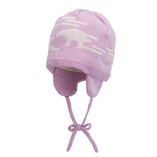 Knitted winter hat for toddlers. The lining of the hat is made of cotton jersey and the top is made of acrylic yarn. For more comfortable wearing, the hat has laces and small flaps that protect the ears.