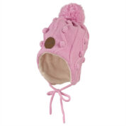 A knitted winter hat for girls. The lining of the hat is made of cotton jersey and the top is made of acrylic yarn.