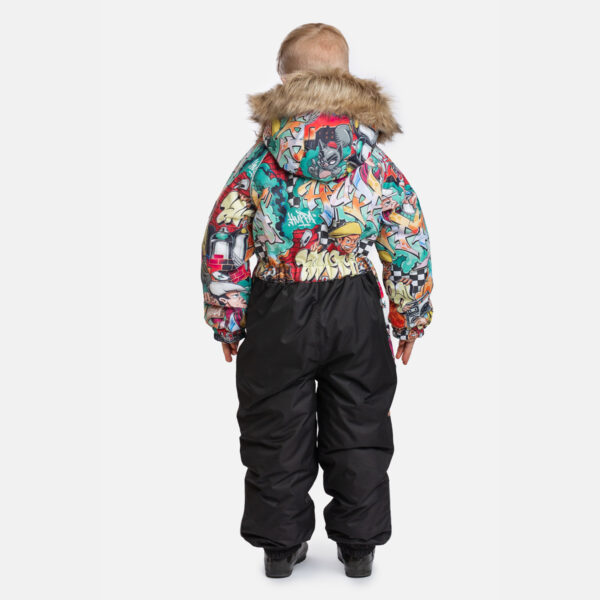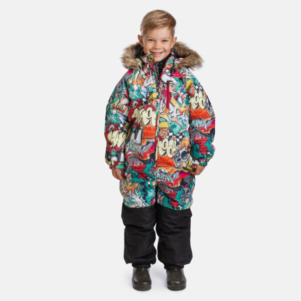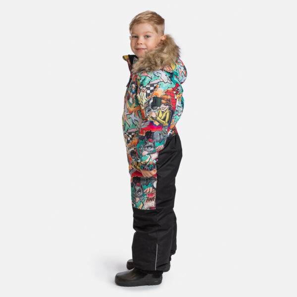Ūdensdrošs un vēja necaurlaidīgs ziemas kombinezons bērniem ar siltinājumu 200 g. Elpojošs materiāls. Kombinezona iekšpusē mīksta odere. Piedurkņu un staru galos, kā arī kapuces malā ir iestrādāta gumijas lente. Noņemamā kapuce piestiprināma pie apkakles ar spiedpogām. Jostasvietā iestrādāta gumijas lente ar pogcaurumiem. Ūdensdroši nolīmētas šuves. Komplektā elastīgas pazoles gumijas. Uz virsējā materiāla atstarojošas detaļas.