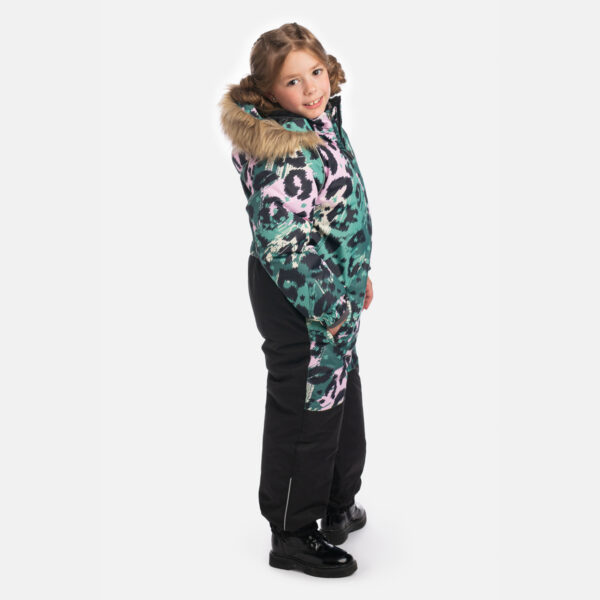 Bērnu ūdens un vēja necaurlaidīgs kombinezons. Gaisu caurlaidīgs virsējais audums. Kombinezonam mīksta odere. Piedurknēs un staru malās iestrādāta gumijas apdare. Noņemamā kapuce pie apkakles stiprināma ar velkro aizdari. Priekšpusē apšūtas kabatas. Ūdens necaurlaidīgi līmēti izšuvumi. Komplektā elastīgas pazolītes. Kapucei noņemama mākslīgās kažokādas mala. Auduma virspusē atstarojošas detaļas.